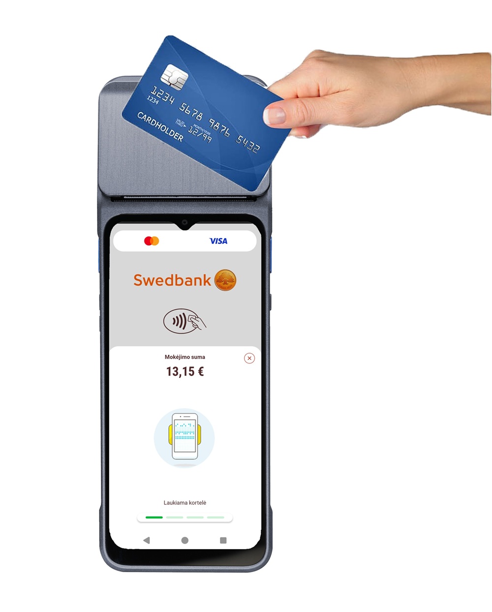 Phone POS aplikacija diegiama į Android POS įrenginį (pvz. Landi M20), kuris: